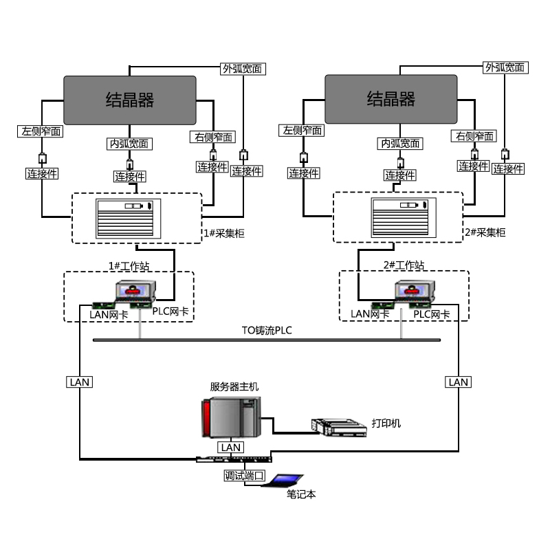BPS-K600 连铸结晶器漏钢预报系统 硬件部分主要由温度传感器 、连接件、前端数据采集、操作站(工作站) 及服务器,这些设备组成一个独立的测量、运算及预报网络,并通过网关与 铸流 PLC交互数据,实现报警控制。BPS-K600连铸结晶器漏钢预报系统 采用在结晶器铜板四周预埋设多排电偶, 检测钢水在结晶器冷却过程中的温度变化,实现结晶器温度场显示及漏钢状况预报。温度传感器阵列采集的温度信号经连接模块传输至前端采集系统,将信号进行各种滤波、归一化,通过网络数字化传输到送操作站(工作站)及服务器,由漏钢预报系统软件包对数据进行运算, 获得用户所需要的结晶器信息和实现漏钢监测。